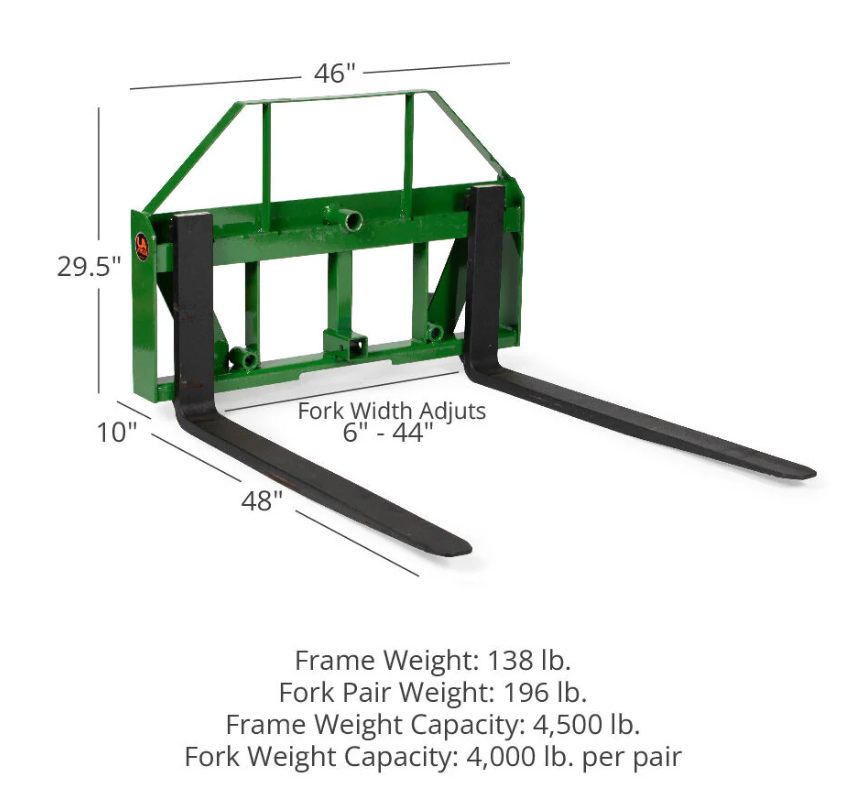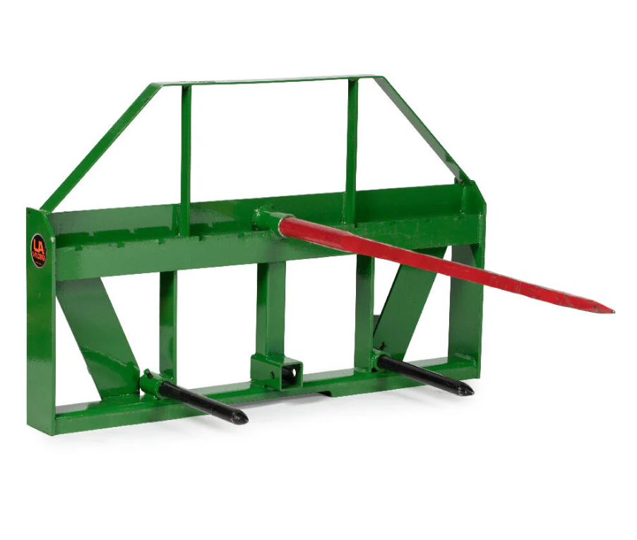 L'attacco del telaio di fieno dispone di un attacco e maniche da 2 pollici per l'installazione di lancette di balle di fieno e barre di carrello scanalato per le lame della forcella di pallet di classe II di montaggio.