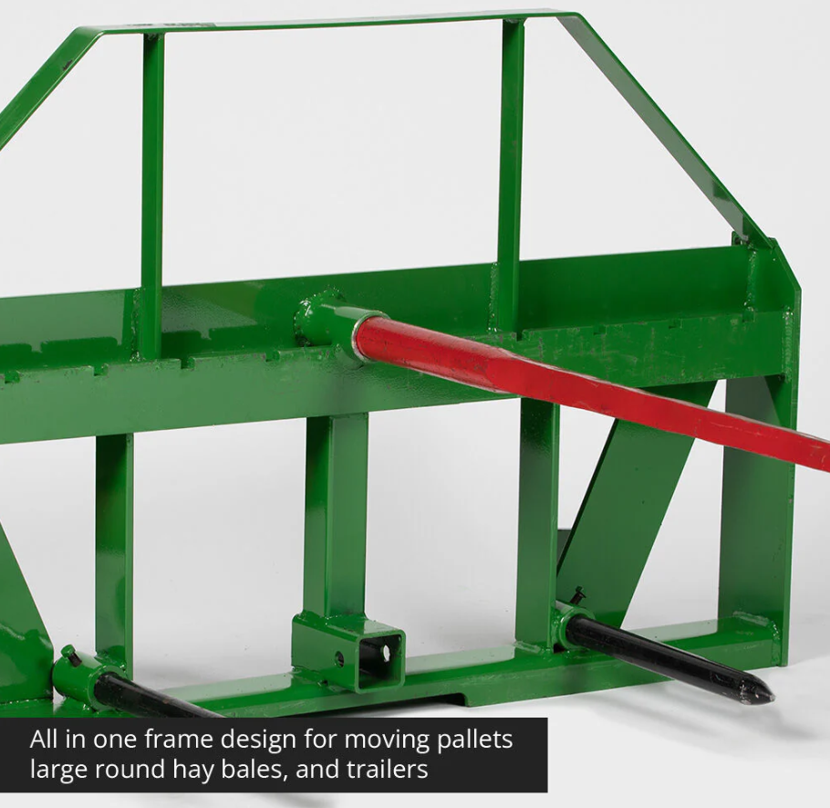 Un rack di mal di testa trasparente viene saldato al telaio per aumentare la sua durata e capacità e aggiungere sicurezza ai bracci del caricatore. Non c'è bisogno di preoccuparsi di tronchi, balle di fieno e altri oggetti che vengono trasportati dalla caduta sui bracci del caricatore. Tutti questi verranno standard con questo attacco di fieno. Non è necessario disporre di un telaio per balle di fieno, una per spostare pallet e detriti e un altro per i rimorchi in movimento. Usa questo fotogramma per sostituirli tutti!